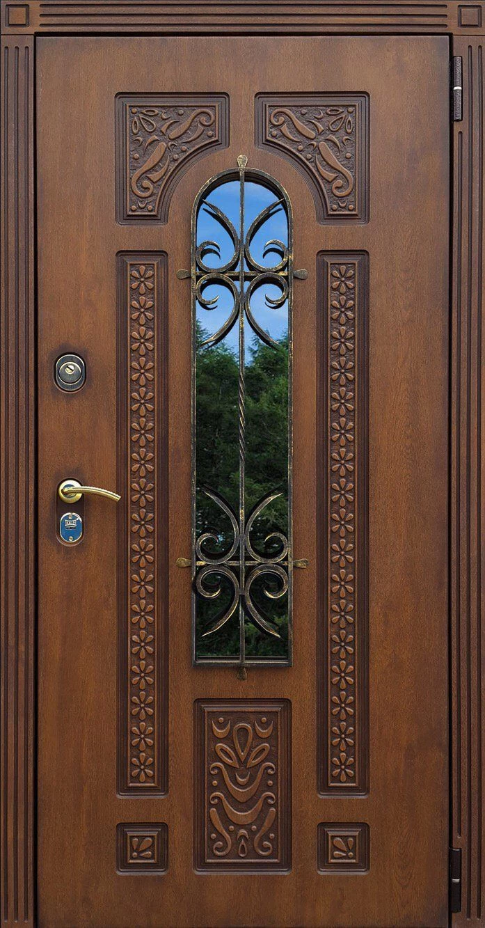 При изготовлении двери с отделкой виноритом на заказ, её можно сделать как глухой, так и декорированную вставками из стекла с элементами ковки. Для установки в дом такую дверь можно сделать с применением терморазрыва, и эта дверь будет надежно сохранять в доме тепло, не промерзая и не конденсируя.